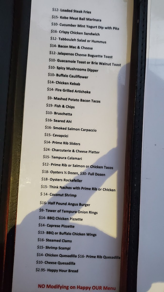 Steaks and Main Courses: The menu features a range of steak options such as Ribeye Steak, Center Cut Filet Mignon, Tomahawk Steak, and Pepper Crusted Chateaubriand. Specialty items like Prime Rib Special, Surf and Turf, King Crab Legs, and Lobster Tail provide additional choices beyond traditional cuts. Seafood selections include Shrimp Cocktail, Steamed Clams, Fish & Chips, Oysters Rockefeller, and Oysters on the Half Shell.